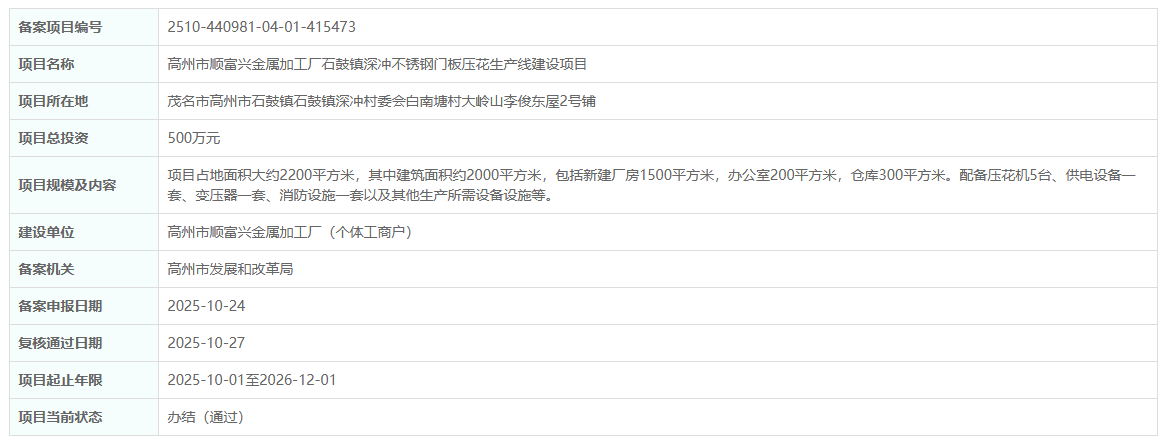 2025年10月27日,高州市順富興金屬加工廠石鼓鎮深沖不銹鋼門板壓花生產線建設項目備案復核獲通過。